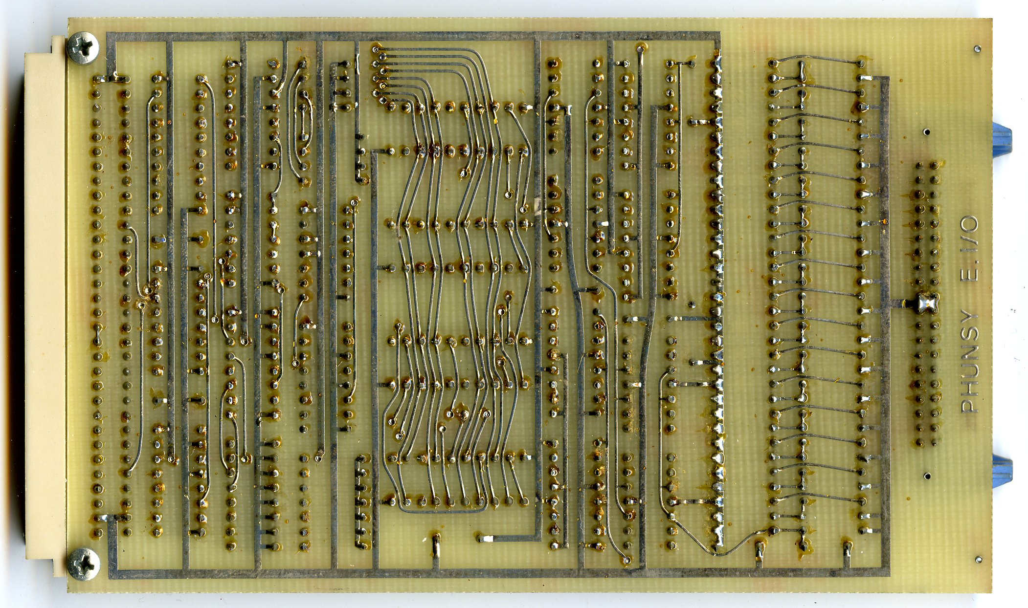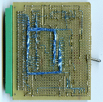 | Phunsy-2 6809 micro computer. This should have been my 2nd generation system. It had lots of features but I never finished it. The other side of the board has no wires;-) Just a bit later I had an Atari ST and it was no use completing this board as it was impossible to keep up with the fast growing technology. Although the 6809 cpu never really made it, I still think this was one of the greatest 8-bit cpu's. The two missing IC's on the board should have functioned as collor look-up table for the video signal. | |